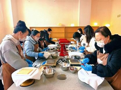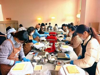 此外,学校组织的烘焙DIY体验活动也深受欢迎。女教职工们换上围裙,在专业烘焙师的指导下,认真学习蛋糕抹面、裱花装饰等技巧。大家两两协作,将巧思融入每一个步骤,亲手打造出造型精美的蛋糕作品,现场暖意融融、香气四溢,欢声笑语不断。